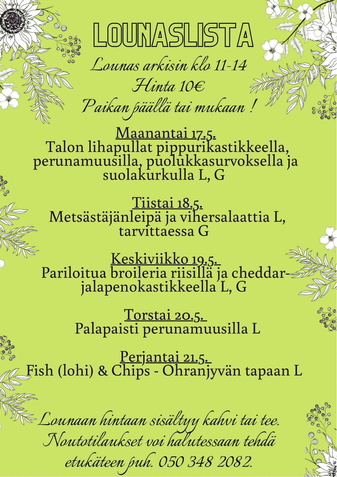 Lounas tilattavissa ja noudettavissa myös Take Awayna soittamalla numeroon 050 348 2082.